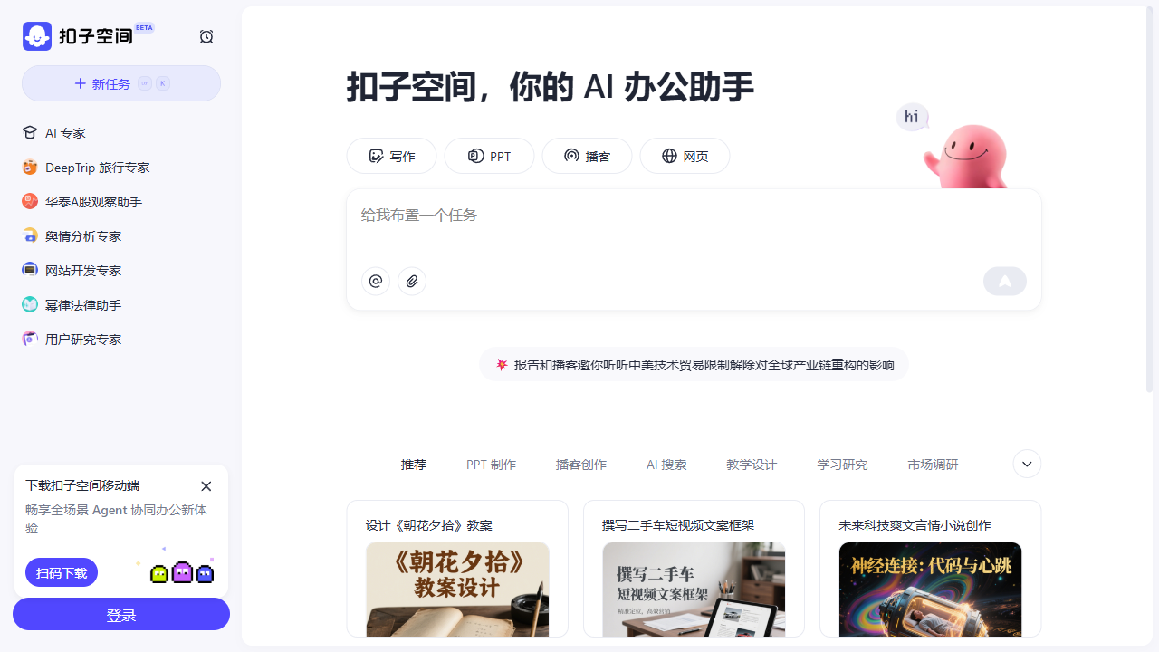 Coze.cn 是字节跳动旗下的中文 AI 应用开发平台,面向无编程基础的个人与企业。用户通过图形化界面即可创建、调试并发布多平台聊天机器人或完整 AI 应用。平台集成主流大模型(如豆包、Kimi),提供插件市场、知识库、长期记忆、计划任务等能力,并支持一键部署到微信、飞书、豆包等渠道。2025 年全新升级为「应用搭建平台」,新增可视化 UI 编辑与模板市场,实现从对话机器人到全栈 AI 应用的跨越。
