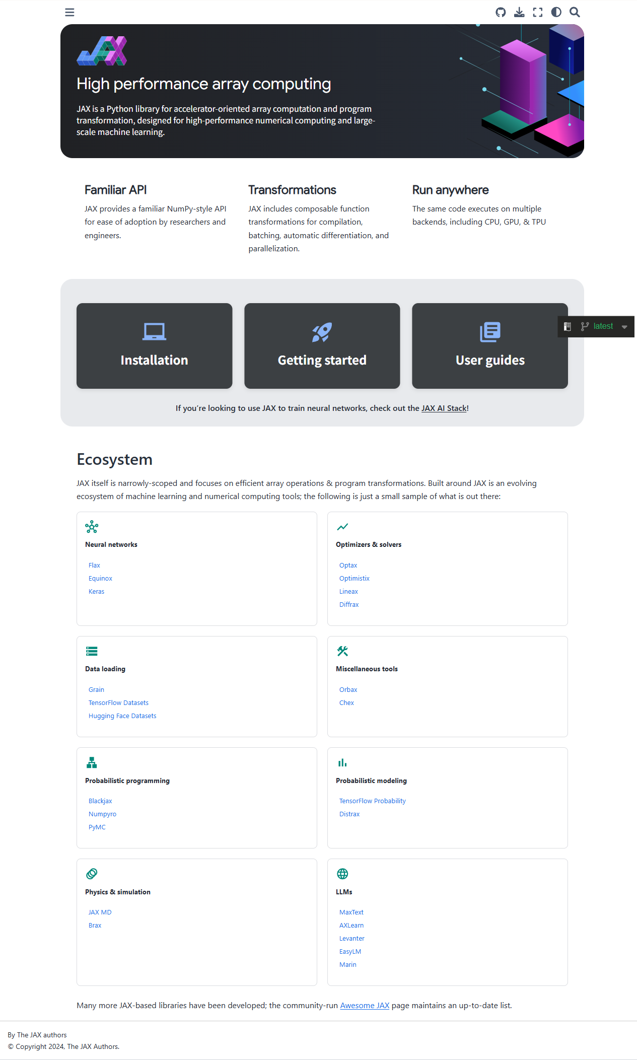 JAX官方文档是谷歌开源项目JAX的权威门户,围绕“NumPy+Autograd+XLA”三大核心,提供从安装、快速上手到深度优化的全流程指引。内容覆盖基础API、即时编译(JIT)、自动微分、向量化/并行化、随机数、调试技巧及生态扩展(如Flax、Optax)。文档以交互式Notebook示例为主,辅以性能分析、迁移指南与常见问题,帮助研究者和工程师在CPU/GPU/TPU上高效实现科学计算、机器学习及深度学习任务。
