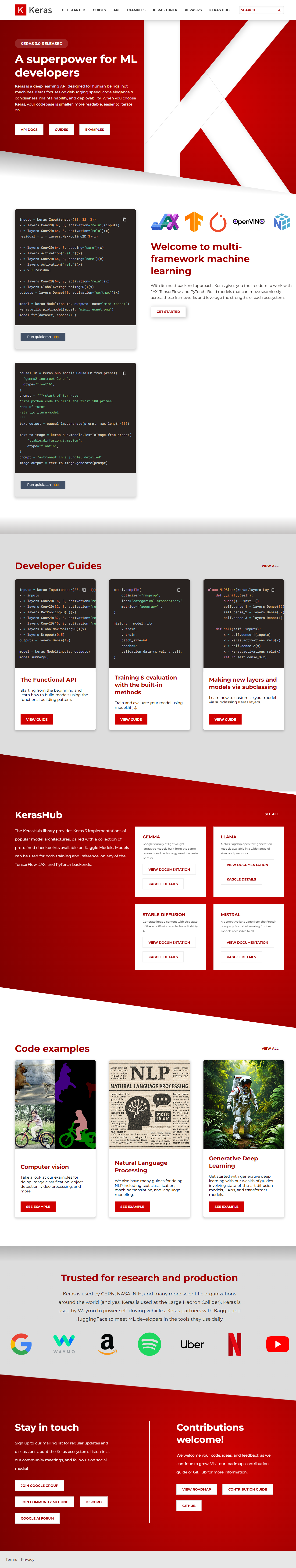 Keras.io 是 Keras 深度学习框架的官方网站,由 François Chollet 创建并持续维护。网站以“Human-Centered Deep Learning”为理念,面向研究者、工程师及初学者,提供从安装到部署的全流程中文/英文文档。核心内容覆盖 tf.keras(TensorFlow 2.x 内置版)与独立 Keras 3.x 的 API 参考、教程、示例代码、博客更新及社区贡献指南,并支持一键在线运行 Colab Notebook,帮助用户零门槛验证模型。