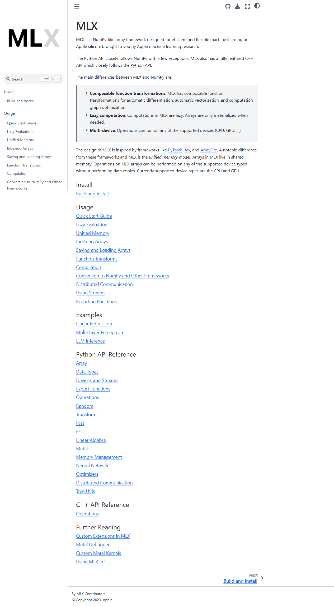 mlx-explore.github.io/mlx 是 Apple 机器学习团队为 MLX 框架维护的权威门户。站点以极简白色主题呈现,顶部导航栏直达安装、教程、API 与示例四大板块;侧边栏自动展开当前章节,方便跳转。首页用一句话阐明愿景:专为 Apple Silicon 设计的 NumPy/PyTorch 式阵列框架,支持高效训练与部署。页面内嵌交互式代码块,可一键复制到本地 Jupyter。底部列出 GitHub 仓库、问题追踪与贡献指南,方便社区协作。