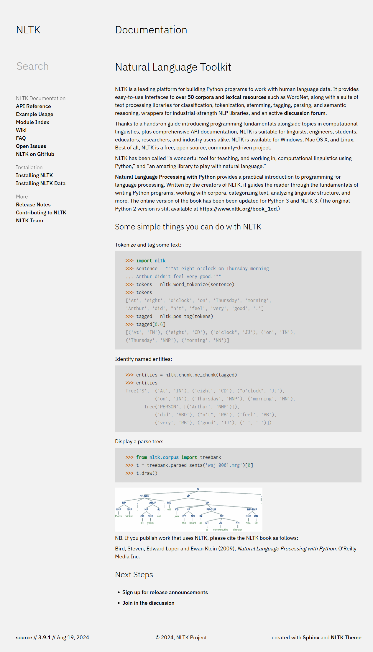 NLTK.org 是自然语言工具包(Natural Language Toolkit)的官方网站,面向全球研究者和开发者提供开源 Python 库、语料库、教程与 API 文档。网站以“学习-实践-扩展”为主线,首页即给出快速安装命令 pip install nltk,并引导下载必要的数据包。顶部导航栏简洁分为“Install、Book、API、Data、Models、Contribute”六大模块,方便用户按需跳转。页面风格朴素,突出文档与代码示例,减少视觉干扰。底部列出邮件列表、Stack Overflow、GitHub 等社区入口,形成持续反馈闭环。整体定位清晰:既是 NLTK 的权威门户,也是 NLP 初学者的第一站。