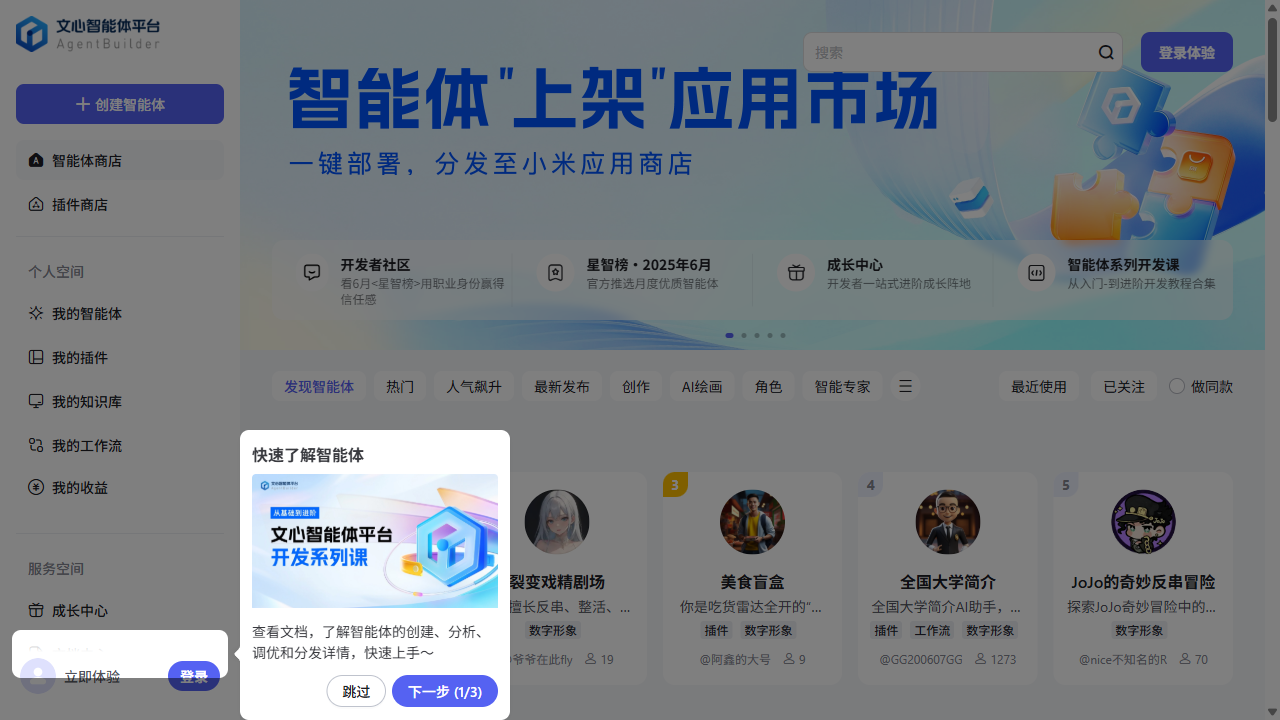 文心智能体平台(agents.baidu.com)是百度面向个人与企业的零门槛AI智能体开发中心,基于文心大模型与千帆大模型服务,提供“一句话生成、零代码配置、全场景发布”的能力。用户无需编程即可通过自然语言描述需求,平台自动完成Prompt、知识库、插件、工作流的编排,并支持一键发布到百度搜索、微信、网页、API等多端。平台内置丰富的官方模板、行业插件及流量入口,帮助创作者快速实现创意落地与商业变现。