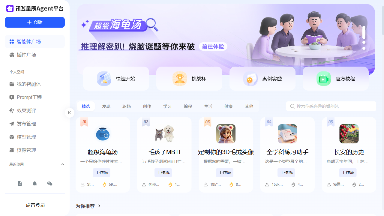 讯飞AI智能体中心(agent.xfyun.cn)是科大讯飞面向企业与个人推出的在线智能体构建平台。无需编程,用户通过自然语言描述需求,即可在数分钟内生成可发布的AI应用(智能体)。平台提供大模型、语音、图像、知识库等全栈AI能力,覆盖营销、客服、办公、教育、政务等场景。