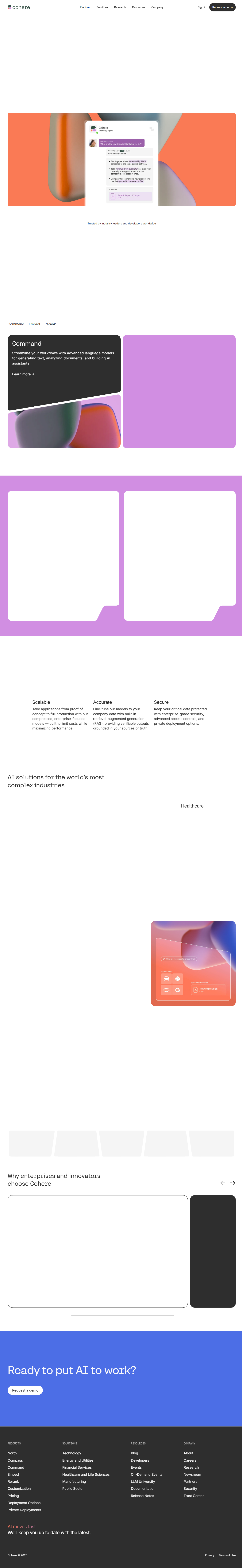 Cohere 是一家总部位于多伦多和旧金山的加拿大 AI 公司,专注为企业、开发者提供安全、可定制的大语言模型(LLM)及配套工具。平台由《Attention Is All You Need》作者之一 Aidan Gomez 于 2019 年联合创立,已获英伟达、甲骨文、Salesforce 等 9.7 亿美元投资。网站提供多语言生成、嵌入、重排、搜索、Agent 等 API,支持本地 VPC、私有云或 SaaS 部署,符合金融、医疗、政府等高合规场景需求。用户可通过 Playground 在线体验,也可在 AWS、Azure、OCI 市场一键调用。