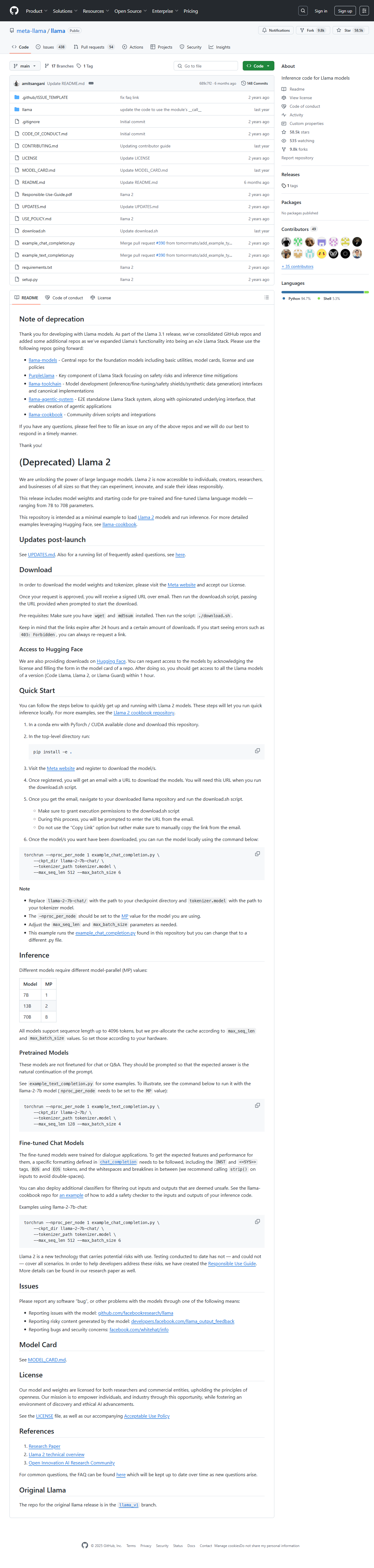 LLaMA(Large Language Model Meta AI)是Meta于2023年2月发布的基础大语言模型系列,参数规模7B–65B。官网仓库托管在GitHub facebookresearch/llama,提供完整源码、权重申请脚本、推理示例、LoRA微调示例及社区贡献的llama-recipes。模型仅用公开数据训练,遵循非商业研究许可,可在单张A100 80G GPU或更小的消费级显卡上运行,实现接近GPT-3的效果,为研究者和开发者提供可复现、可扩展的开源基座。