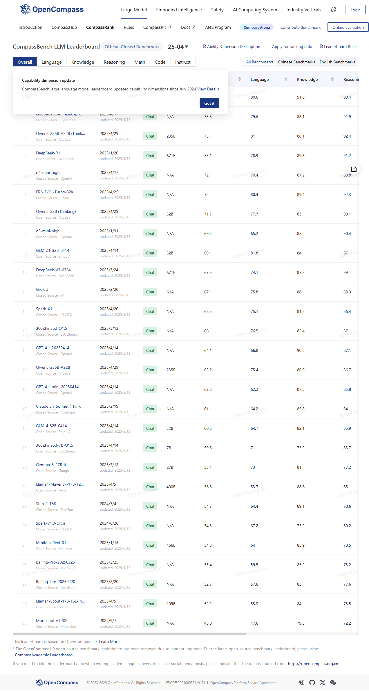 OpenCompass 司南大模型公开榜单由上海人工智能实验室 2023 年 8 月推出,定位“大模型能力体检中心”。平台以完全开源、可复现的评测框架为核心,持续对国内外主流大语言模型与多模态模型进行标准化测试,并实时发布权威排名。榜单数据每月更新,结果同步至 Hugging Face Spaces,面向学术界、产业界及开发者免费开放,旨在打造中文世界最可信的模型性能参照系。