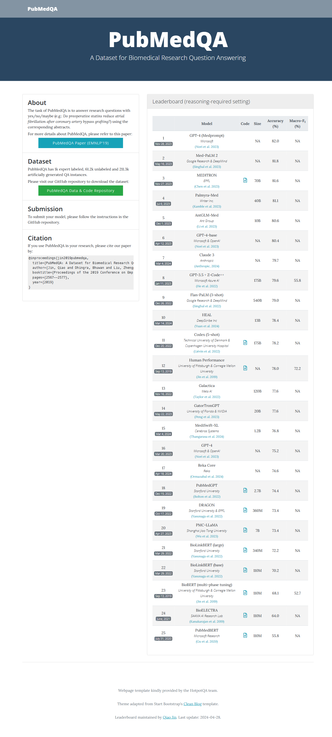 PubMedQA由卡内基梅隆大学团队于2019年发布,是目前唯一要求模型对生物医学摘要中的定量结果进行推理才能给出 yes/no/maybe 答案的公开数据集。站点提供约27.4 万条实例:1K 专家手工标注、61K 未标注真实摘要、211K 人工合成问答,覆盖心血管、肿瘤、药剂学等广泛主题。除数据下载外,官网实时展示18+ 个模型(BioBERT、Med-PaLM 等)的排行榜,并给出论文、代码与基线脚本,方便研究者复现与提交新结果。