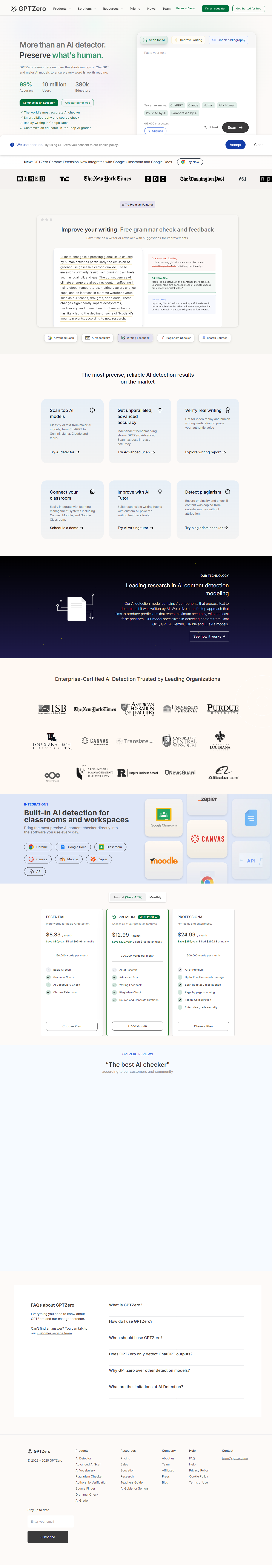 GPTZero 是普林斯顿学生 Edward Tian 于 2023 年推出的 AI 内容检测平台,专注识别文本是否由 ChatGPT、GPT-4、Bard、LLaMa 等大模型生成。平台通过 7 层深度学习模型逐句分析困惑度与突发性,给出 AI 占比和可疑段落高亮。官网 gptzero.me 提供免费在线检测、批量文件扫描、浏览器插件及 Word 加载项,支持 PDF/Word/TXT 等多格式,无需注册即可试用。截至 2025 年,全球超 500 万教育工作者、招聘官、编辑与学生每日使用,API 日调用量超 1000 万次,并获 UNESCO 数字诚信推荐。