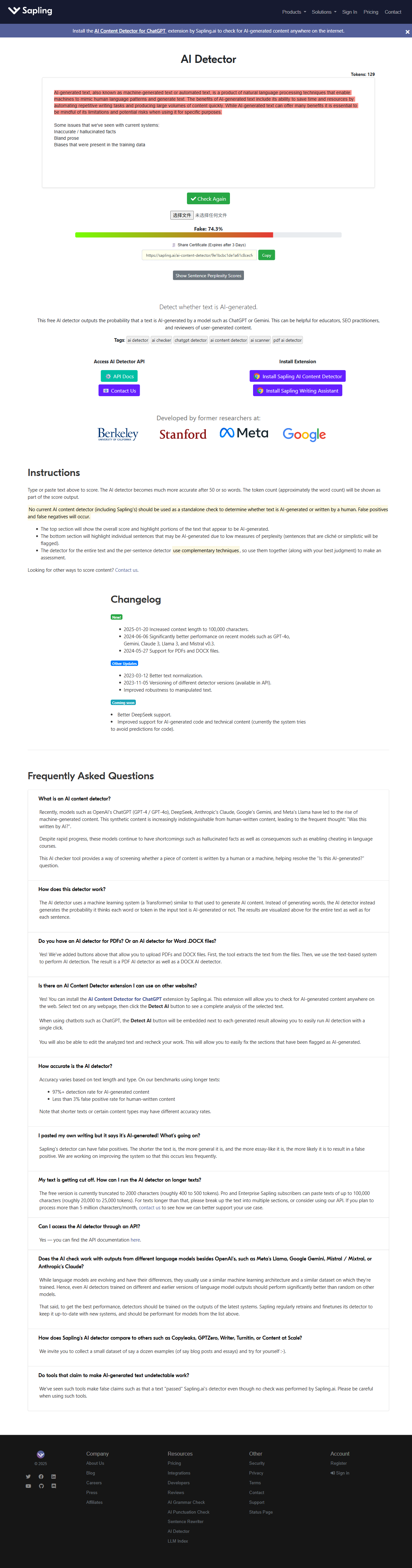 Sapling AI Content Detector 是 Sapling.ai 推出的在线 AI 内容检测工具,用户无需注册即可将文本粘贴到网页中,实时获得该文本由 ChatGPT、GPT-4、Gemini 等模型生成的概率。网站界面极简,支持 50 字以上的短文本,也能上传 PDF/DOCX,自动提取文字后分析。检测结果以百分比形式呈现,并用红色下划线高亮可疑句段,鼠标悬停即可查看细节。除网页版外,还提供 Chrome/Edge 浏览器扩展和 REST API,方便教育、出版、SEO、社区审核等多场景接入。