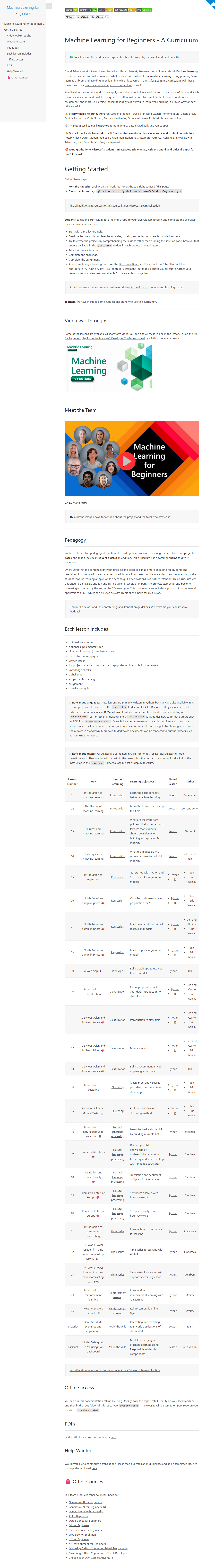 微软官方出品,面向零基础学员的ML-For-Beginners站点,提供12周26课时的完整机器学习入门路径。课程以Python+Scikit-learn为核心,涵盖监督/非监督学习、模型评估、Web部署等关键环节,每课配测验、Jupyter Notebook、数据集与课后挑战,完全免费且开源托管于GitHub,支持在线阅读或本地下载,适合高校教学、自学充电及企业内训。