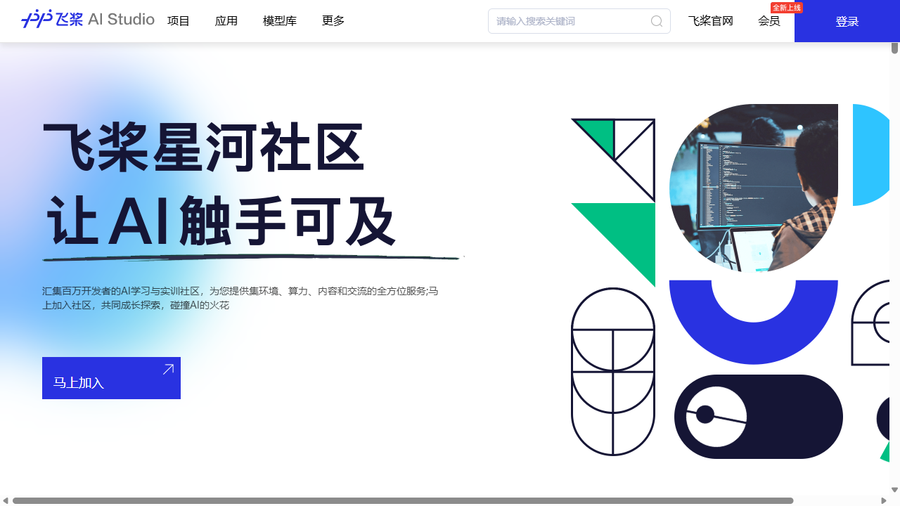 飞桨AI Studio(https://aistudio.baidu.com/)是百度推出的面向人工智能学习者的云端一站式平台,集课程、算力、数据、开源项目于一体。平台以“学习-实践-比赛-交流”闭环为核心,提供从入门到大模型落地的全栈支持,并依托飞桨深度学习框架,为高校、企业及个人开发者提供免费的GPU算力、丰富的数据集和即开即用的Notebook环境,降低AI开发门槛,助力快速进阶。
