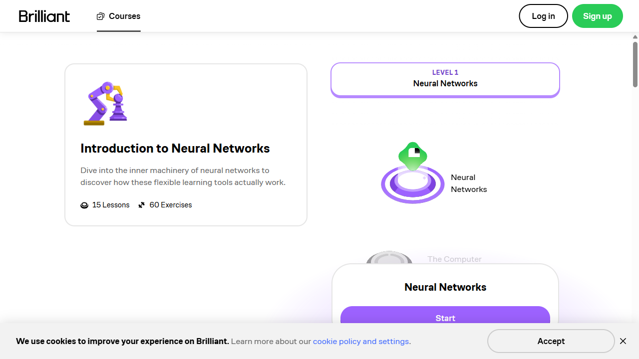 Brilliant.org 是一个以交互式问题驱动为核心的在线学习平台,其《Intro to Neural Networks》课程专为零基础到中级学习者设计,用可视化实验与即时反馈拆解神经网络的黑箱。课程无需复杂数学或编程背景,仅要求会基础代数与逻辑概念,即可通过拖拽神经元、调整权重等小游戏,亲手“搭建”从感知机到卷积网络的完整链路,直观理解 AI 如何识别图像、下棋或做决策。