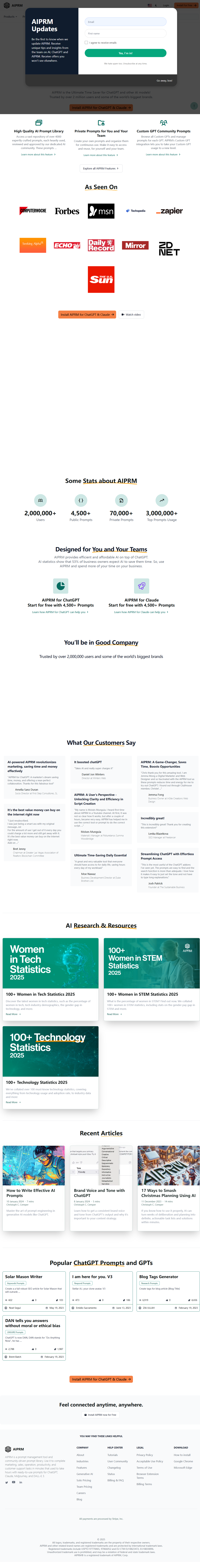 AIPRM(Artificial Intelligence Prompt Repository & Manager)是一个面向ChatGPT等生成式AI的浏览器扩展与在线社区。它把全球用户贡献的优质提示词(Prompt)集中在一个可搜索、可收藏、可分享的库中,并通过Chrome/Edge扩展直接嵌入ChatGPT界面,实现“选提示—填变量—一键生成”的零门槛工作流。AIPRM由一支德国AI团队于2022年底推出,目前拥有超200万活跃营销人、开发者、教育者,每月新增数千条经过社区投票、官方审核的高质量提示。