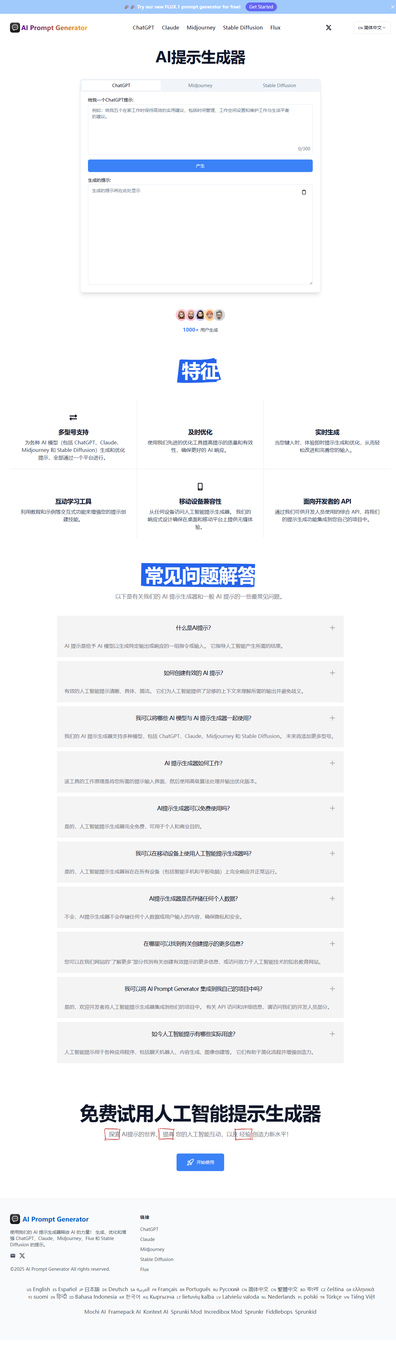 AI Prompt Generator 是一个面向全球中文用户的免费在线提示词生成平台。无需注册即可使用,通过可视化表单与智能模板,帮助用户把模糊需求转化为精准、结构化的 Prompt,适配 ChatGPT、Midjourney、Stable Diffusion 等主流模型。网站界面极简,三步即可拿到可直接复制的提示词,并支持一键保存、分享与迭代。