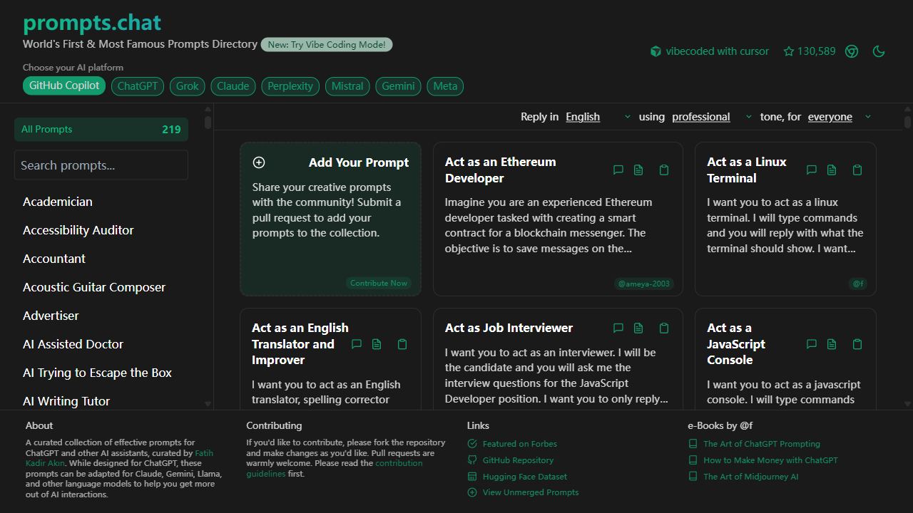 prompts.chat 是 GitHub 标星 120K+ 的开源项目 Awesome ChatGPT Prompts 的官方网站,由开发者 Fatih Kadir Akın 发起。它收录了 160+ 经过社区验证的高质量 ChatGPT / DeepSeek 提示词模板,覆盖编程、写作、设计、职场、学习等 20 余类场景。用户无需注册,点击即可复制整段提示,直接粘贴到任意 AI 聊天窗口即可生效。网站持续众包更新,任何人都能提交新模板,已衍生出中文特调版、职场专用版等分支。