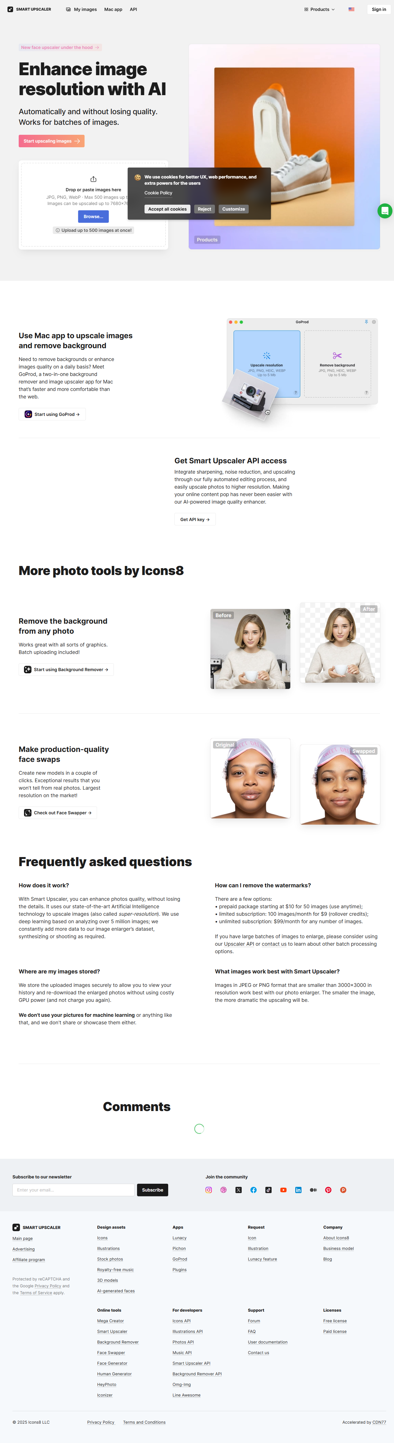 Icons8 Upscaler 是 Icons8 旗下的 AI 图像放大平台,主打“一键无损放大”。它基于深度学习超分辨率算法,可把 1×~8× 的小图标、照片、插画等放大,同时自动降噪、锐化边缘、补全细节,输出最高 7680 px 的 PNG/JPEG。界面极简,无需注册即可试用;注册后享批量、历史记录与 API。支持中英界面,服务器位于全球 CDN,上传即处理,数秒完成。除网页版外,还提供 Windows/macOS 桌面客户端与 Figma、Photoshop 插件,方便设计师嵌入原有工作流。