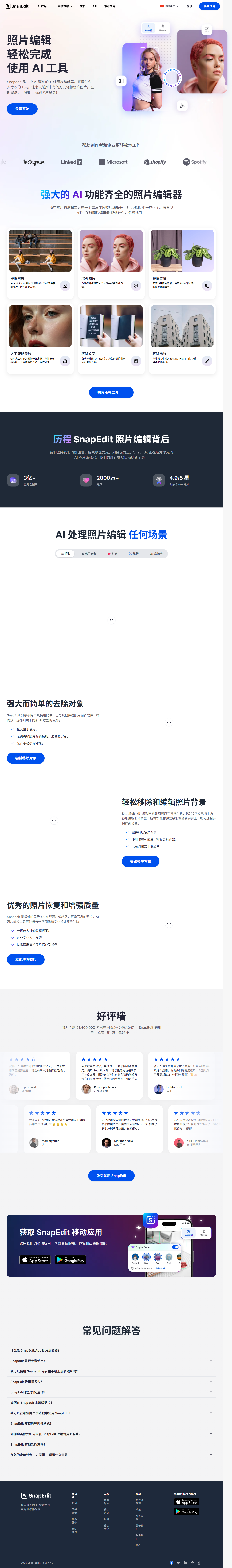 SnapEdit.app 是一个基于人工智能的在线照片编辑器,无需下载软件即可在浏览器或移动端完成专业级修图。网站主打“零门槛”操作,用户上传图片后,AI 会自动识别并移除路人、杂物、水印、文字或电线,同时提供画质增强、背景替换、老照片修复等一站式功能。界面极简,三步出图:上传→选择功能→下载。支持中文,已服务全球 3000 万张图片,评分 4.9/5,免费版即可体验核心功能,订阅解锁高分辨率输出与批量处理。