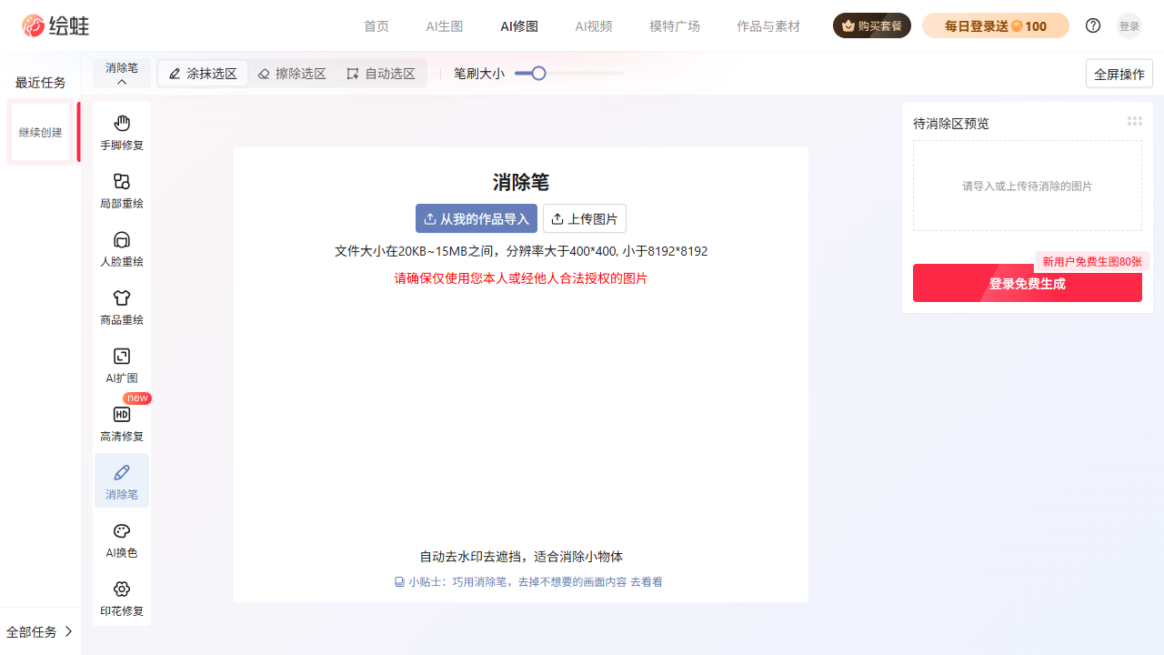 ihuiwa.com/workspace/ai-image/partial-redraw 是绘蛙旗下专注“AI局部重绘”的在线工作台。用户上传图片后,只需用画笔涂抹需要修改的区域并输入一句中文提示词,系统即可在数秒内完成局部内容替换、风格迁移或细节增强,同时自动保持其余画面不变。平台支持电商主图、海报、人像、插画等多种商用场景,提供高清导出、批量处理及团队协作空间,无需安装软件,打开浏览器即可使用。