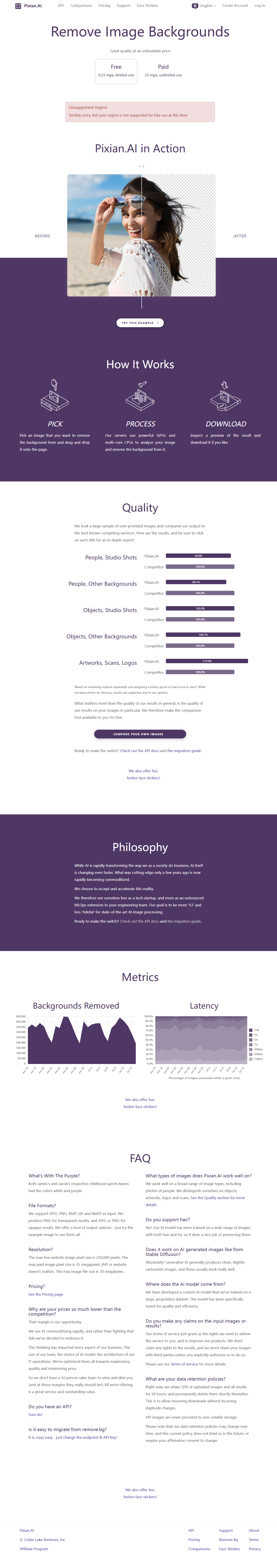 Pixian.ai 是一款由 AI 驱动的在线去背景工具,用户无需注册即可上传 JPEG/PNG/BMP/GIF 等格式图片,系统调用 GPU+多核 CPU 的云端算力,在数秒内完成背景移除并输出透明 PNG。界面极简,只有上传区与下载按钮,支持拖拽、粘贴、URL 三种输入方式;下载前可即时预览抠图效果,并可调边缘羽化、背景色、尺寸。服务对个人每日限量免费,商用需付费升级。整个流程浏览器内完成,无需安装软件,兼容桌面与移动端。