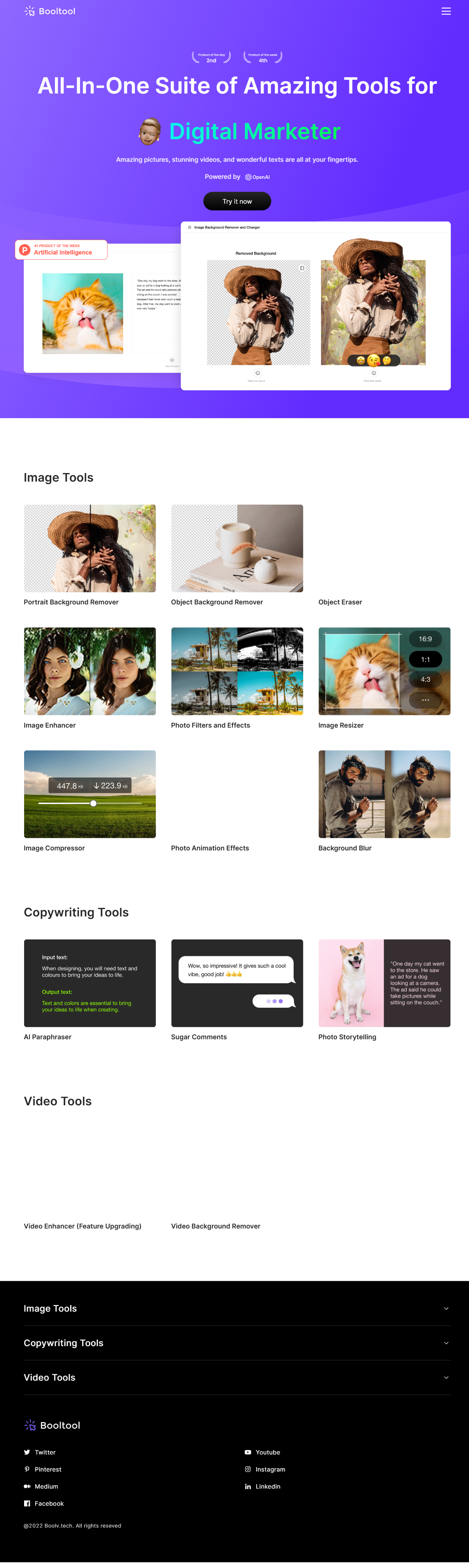 Booltool 是一个面向内容创作者、电商卖家和设计师的一站式 AI 创意工作台,由 Boolv 团队开发。它将图像处理、视频编辑、文案生成等常用功能模块化,全部放在浏览器里完成,无需安装软件。平台基于最新视觉大模型,支持中文界面与支付宝/微信付款,注册即送免费额度。用户上传素材后,AI 会在几秒内给出结果,并可一键下载或分享到社媒。Booltool 还提供 API,方便开发者把能力嵌入到自己的系统或小程序中。