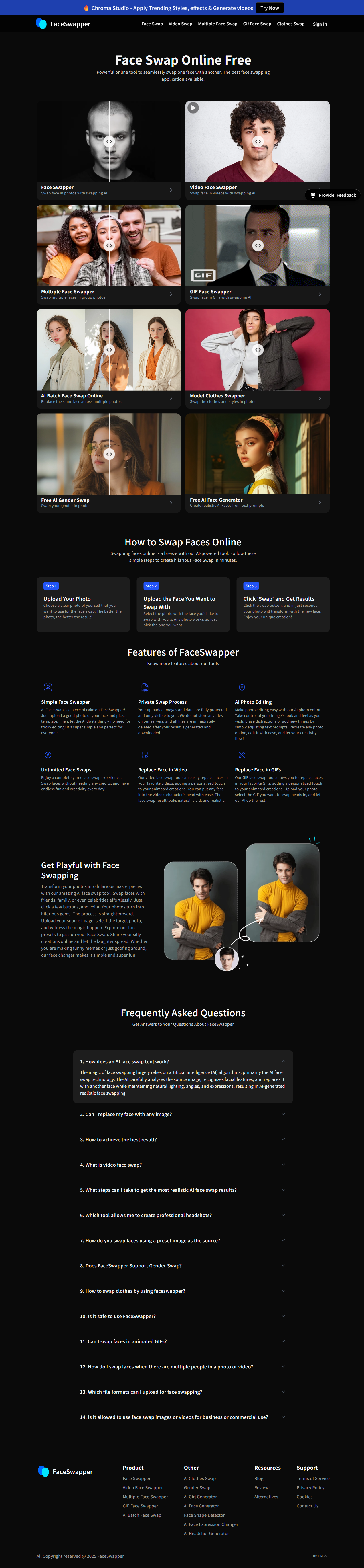 FaceSwapper.ai 是一款基于深度学习的在线 AI 换脸平台,无需安装软件,打开浏览器即可使用。它支持 JPG/PNG 图片及 MP4 视频,自动检测人脸并完成性别、年龄、表情等多维度替换,输出 1024×1024 高清文件。所有运算在云端 GPU 完成,平均 10 秒出片,注册即享每日 5 次免费额度,额外次数可通过邀请好友或订阅会员获取。网站遵守 GDPR,上传内容 24 小时内自动删除,保障隐私。