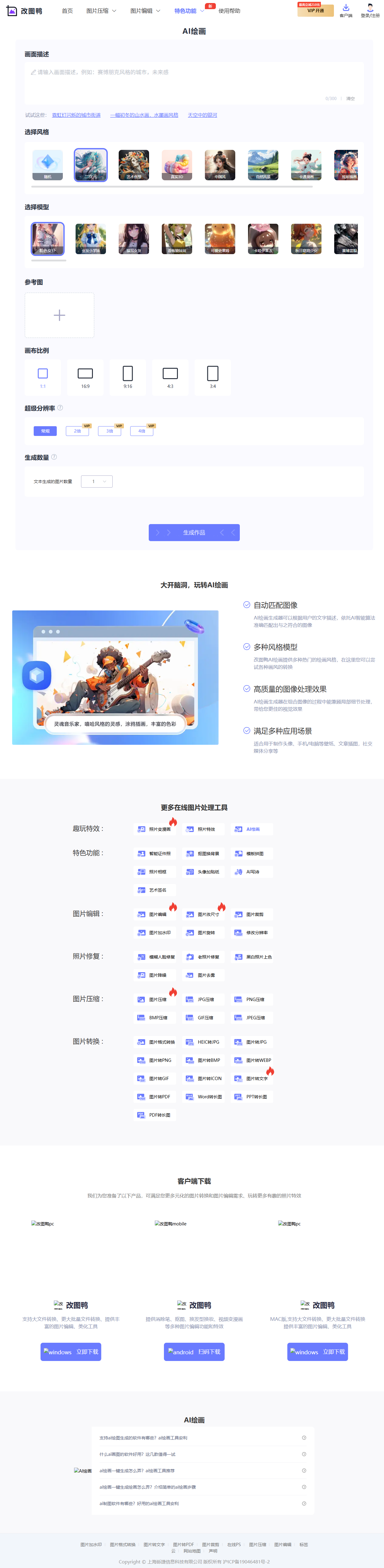 改图鸭-AI图片生成是2025年国内最受欢迎的在线AI绘画平台之一,无需注册即可无限次使用。网站主打“文字秒变高清图”,内置炫彩插画、二次元、3D科幻、国风水墨、真实摄影等数十种热门模型,并支持上传参考图、自定义画布比例、批量出图。除网页端外,还提供APP与小程序,适配手机、平板、电脑多端同步创作,真正做到随时随地“说句话就出图”。
