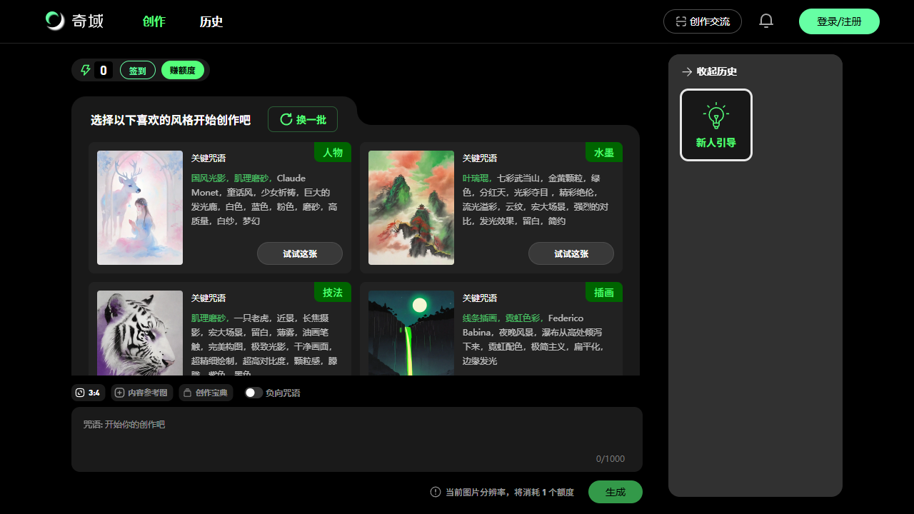 奇域AI(qiyuai.net)是一款扎根中国文化的在线AI绘画平台,专注“中式审美”与“国风意境”。用户只需输入文字咒语或上传参考图,即可秒级生成水墨、工笔、剪纸、敦煌、民俗等多元中式风格的插画、海报、壁纸、头像、条漫。平台内置海量模板、咒语库与高清重绘,支持尺寸比例、细节微调、负向提示,适配小红书、公众号、文创、文旅、教学、电商等多场景视觉需求。注册即用,网页+小程序双端同步,作品可一键分享社区,亦可商用无忧。