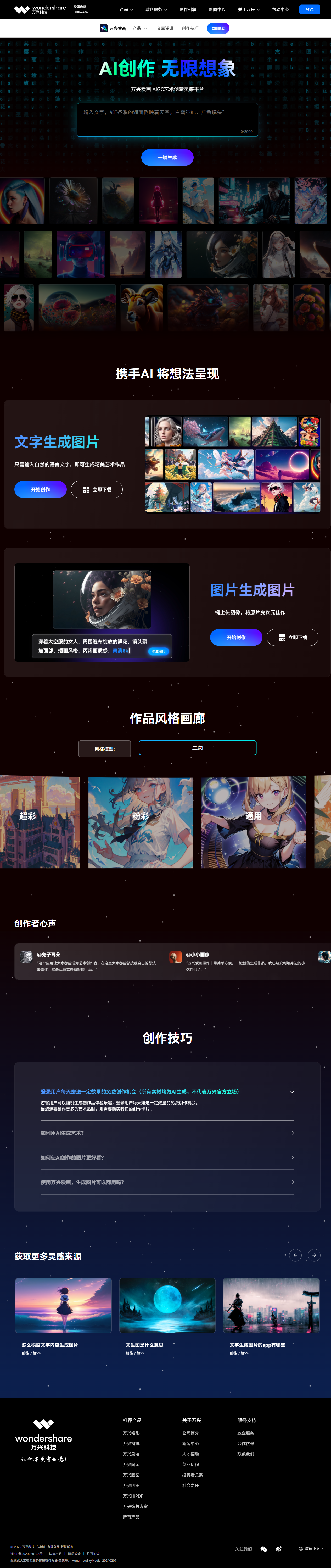 万兴爱画(aigc.wondershare.cn)由万兴科技推出,专注“零门槛AI绘画”。用户只需输入中文或英文描述,即可在10秒内生成高分辨率插画、概念稿、二次元或写实作品。平台内置20+热门风格模型、提示词库及高级参数(分辨率、采样步数、负面提示),支持每日免费生成、作品一键下载与社区分享,并提供版权归属保障,适合设计师、自媒体、学生及爱好者快速获取灵感。