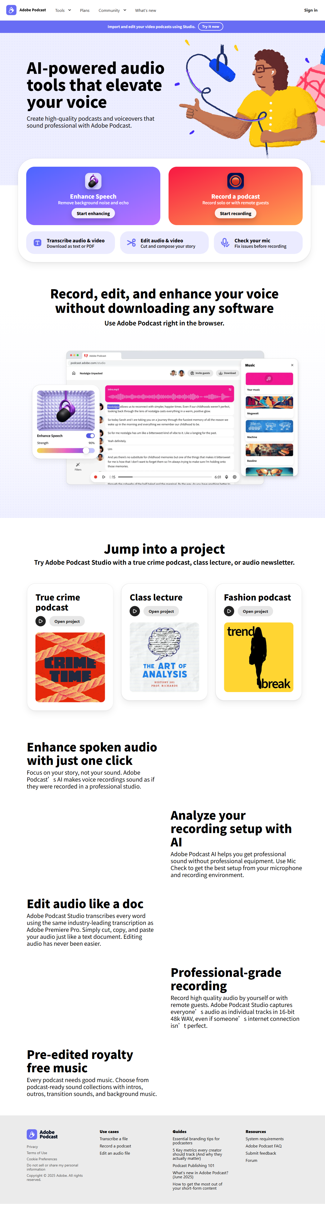 Adobe Podcast 是 Adobe 推出的全云端播客与语音创作平台,无需下载软件,打开浏览器即可使用。它把专业录音棚的音质标准与 AI 智能处理搬到线上:自动降噪、均衡、去混响,让普通麦克风也能录出干净、饱满的人声。平台内置逐字转写引擎,把音频变成可编辑的文本,剪切、粘贴、删除文字即可同步剪辑音轨,彻底告别波形拖拽。完成后的节目可一键生成多格式文件,或直接分享链接,方便团队协作与发布。所有工程实时保存在云端,换电脑也能继续创作。