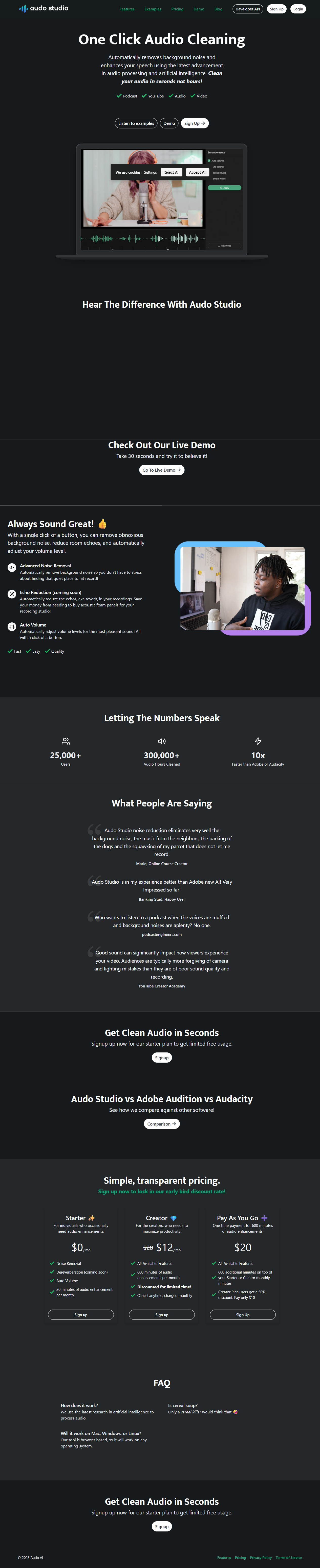 Audo.ai 是一款面向播客主、视频创作者、在线讲师等“声音工作者”的在线音频清理工具。无需安装软件,打开浏览器即可上传录音,系统通过 AI 算法自动去除背景噪音、回声、电流声,并智能提升语音清晰度与响度。界面极简:上传→处理→下载,三步完成。支持常见格式(MP3/WAV/M4A),单文件最长 2 h,处理后保留原始采样率与位深,可在线试听对比。平台采用订阅+按需付费模式,新用户注册即送 20 min 免费额度,随时可升级套餐。所有文件 7 天后自动删除,全程 HTTPS 加密传输,符合 GDPR 隐私规范。