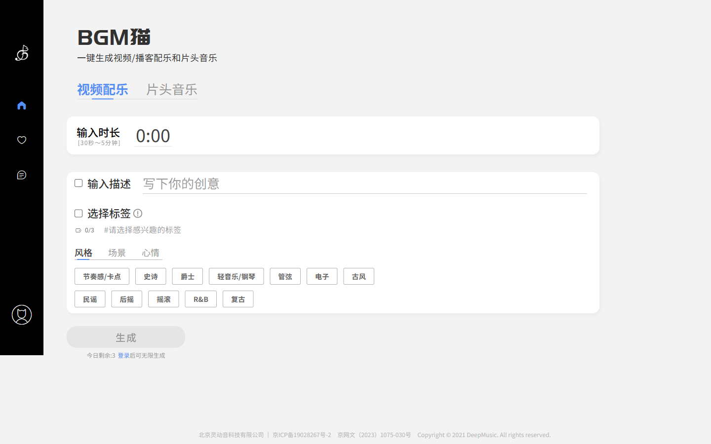 BGM猫是北京灵动音科技有限公司推出的在线AI音乐平台。用户无需乐理基础,仅需选择时长、场景、风格、心情等标签,数分钟内即可获得一段高质量、无版权纠纷的背景音乐,可立即下载并用于短视频、播客、广告、游戏等商业或个人项目。平台采用自研深度学习模型,对音乐结构、能量曲线进行细粒度控制,确保每一段输出都“卡点”精准、情绪到位。所有作品默认授予全用途、不限渠道的商用授权,并支持在线试听、循环微调、一键重新生成,真正做到“零门槛、零版权风险”。