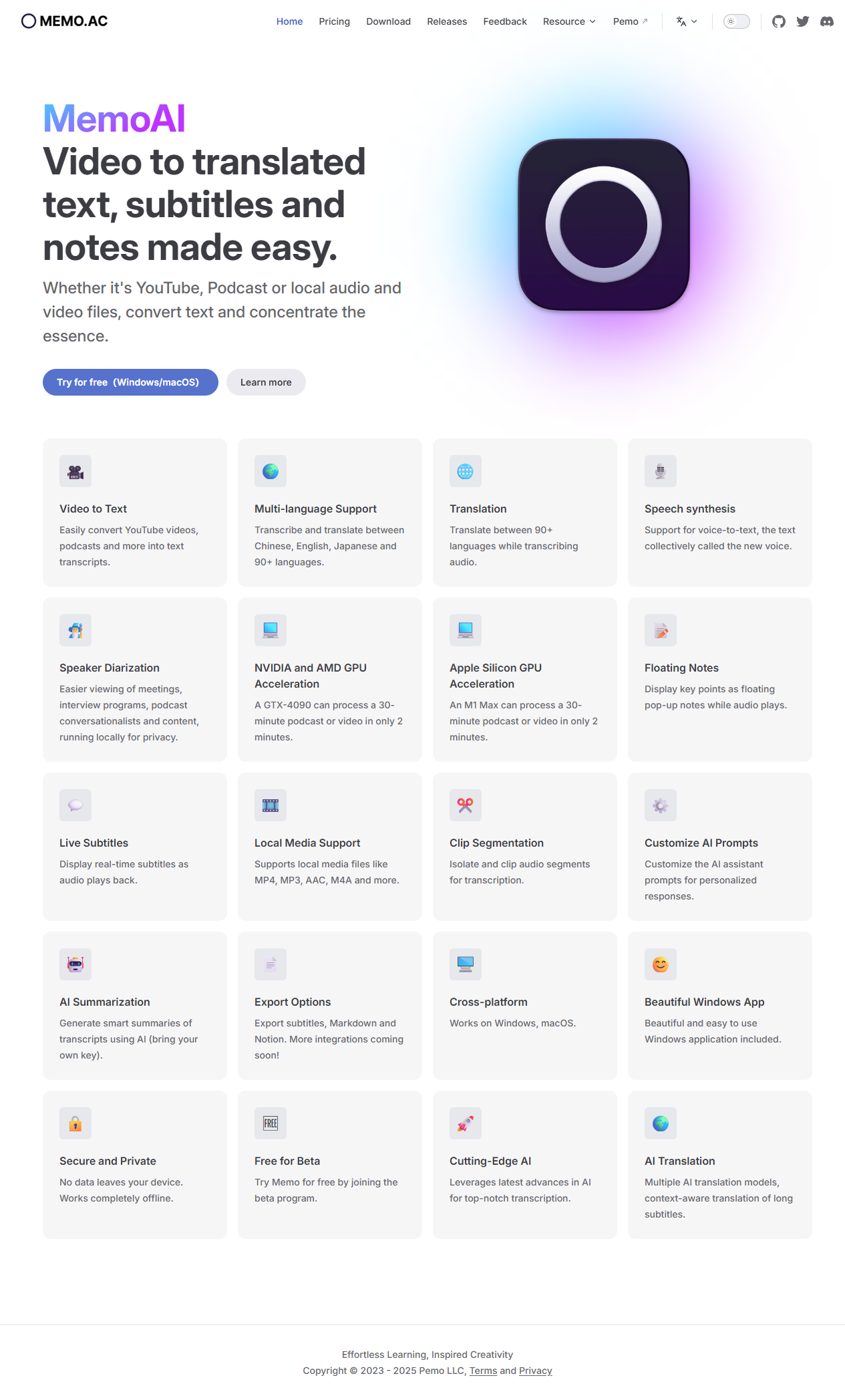 Memo.ac 是一款面向全球用户的 AI 音视频转写平台,无需注册即可在线使用,也提供 Windows / macOS 本地客户端。它利用自研与第三方大模型,将 YouTube、播客链接或本地 MP4/MP3 等文件快速转录为可编辑文本,并同步生成双语字幕、时间戳笔记与 AI 摘要,支持中、英、日等 90 多种语言互译。网站界面极简,20 MB 以内文件免费体验,输出格式覆盖 SRT、VTT、Markdown、Notion,方便二次创作、学习与分享。