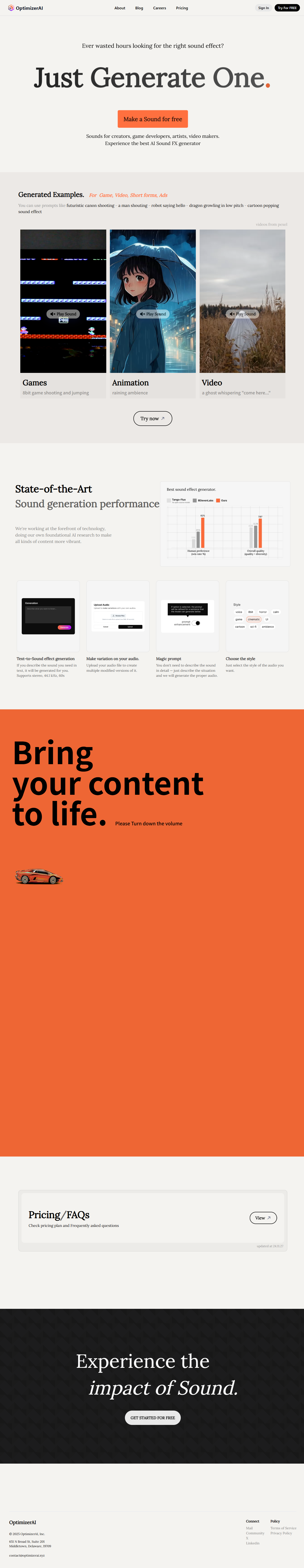 OptimizerAI 是面向创作者的声音工厂:只需一句中文描述,AI 即刻输出射击、雨声、地铁到站等高质量音效,支持卡通、科幻、8-bit 等风格标签。平台提供在线网页、Discord 双入口,免费试用 25 积分,付费升级后可解锁 44.1 kHz 立体声、无限生成及商用版权。无需专业设备,新手 30 秒即可上手,为视频、游戏、广告、播客即时注入专业声场。