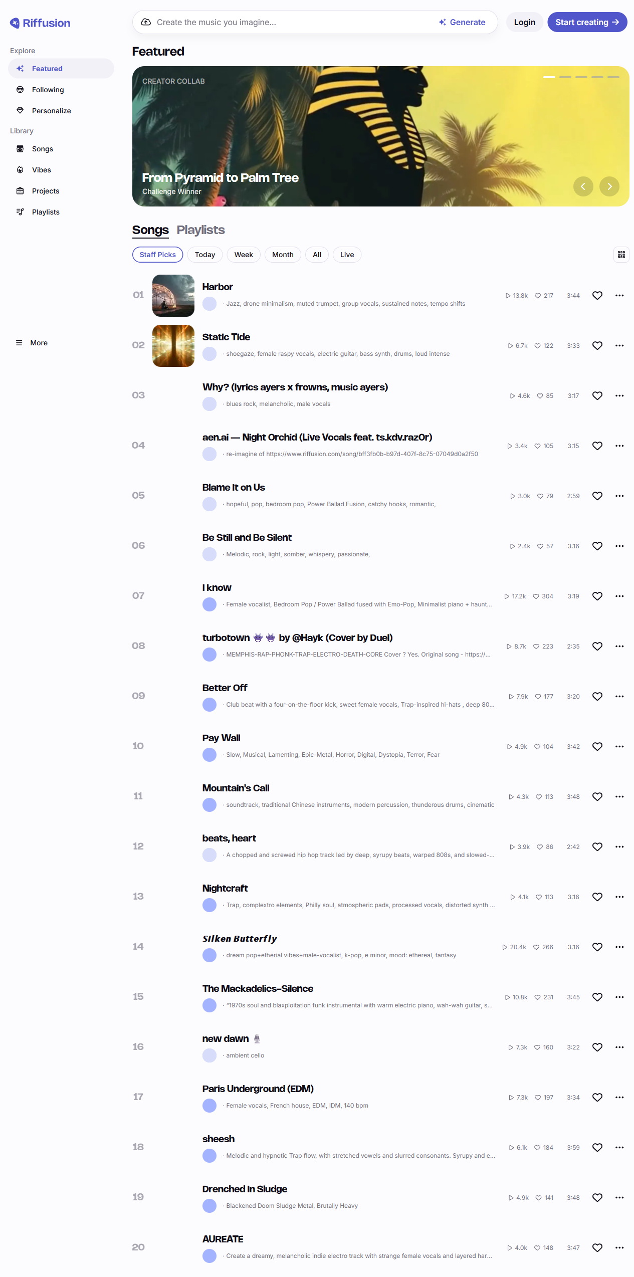 Riffusion 是一个面向音乐爱好者、内容创作者与开发者的在线 AI 音乐生成平台。它基于 Stable Diffusion 技术,把频谱图当作“图像”进行训练,再将生成的频谱图实时解码为可播放的音频。用户只需输入一句中文或英文描述,即可在数秒内获得一段 5-12 秒的原创音乐片段,并可直接试听、下载或二次创作。网站界面极简,无需注册即可体验;注册后可保存历史、调整参数,甚至通过 API 将生成功能嵌入自己的应用。Riffusion 目前完全免费,目标是用最直观的方式把“文字变音乐”带给每个人。