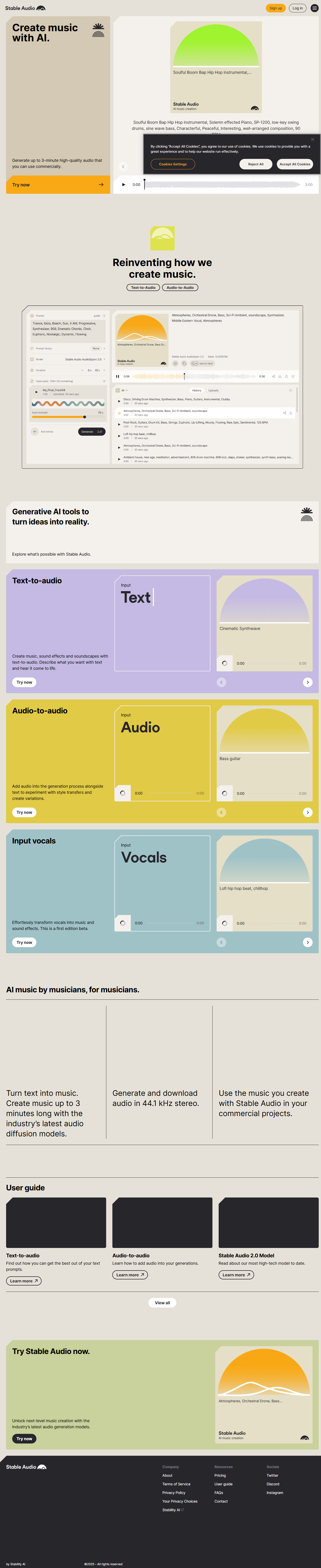 StableAudio.com 由 StabilityAI 官方运营,2024 年升级到 2.0,面向零音乐基础的创作者、自媒体、广告团队,提供“文本/音频→音乐”一站式 AI 服务。网站每月赠送 20 积分,可在线免费生成 44.1 kHz、立体声、3 分钟完整乐曲;注册即用,无需安装软件,生成结果可商用、免版权、可下载 MP3/WAV/Video。后台模型基于 80 万首 AudioSparx 授权数据训练,支持 20+ 风格,提示词越丰富,生成越精准。