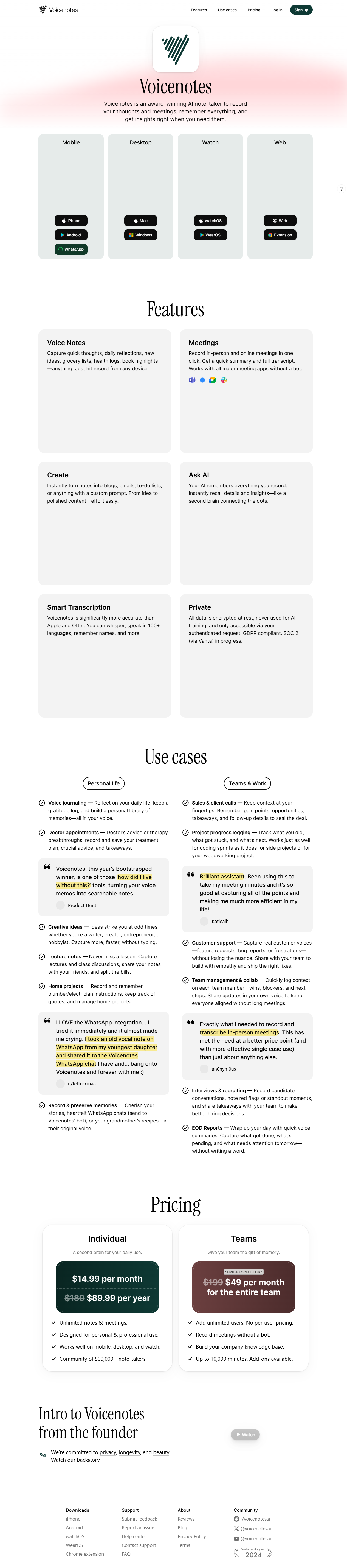 Voicenotes.com 是 2024 年上线的 AI 语音笔记平台,由欧洲团队打造。用户只需按下录音键,即可把任何想法、会议、课程或灵感实时转成可搜索的文字。平台支持 50 余种语言,转写准确率官方宣称达 98%,所有录音与文本自动加密并同步到云端,可在 iOS、Android、Web、Apple Watch 间无缝切换。免费版不限时长录音,但每月仅保留 30 条笔记;付费版解锁无限存储、AI 摘要、团队协作及 API 接入。整体界面极简,录音按钮即首页,主打“开口即完成记录”。
