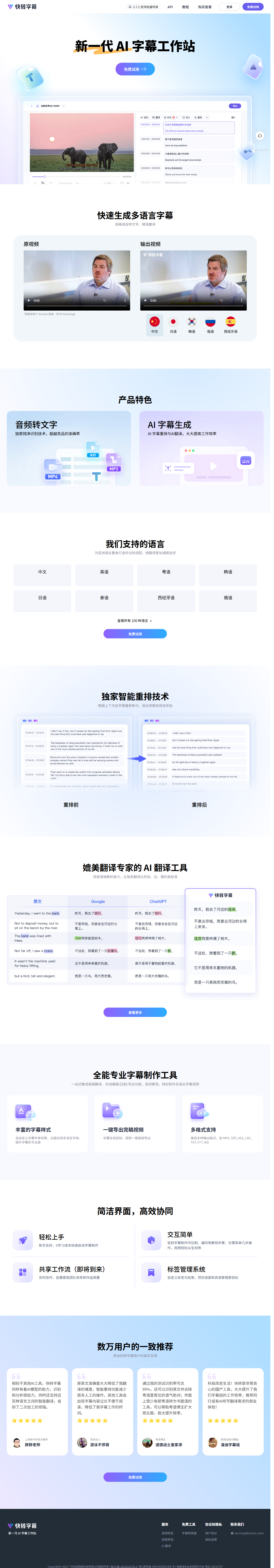 快转字幕(kzzimu.com)是面向视频创作者的专业 AI 字幕平台,专注粤语、普通话及多语种语音转文字。无需安装软件,网页上传即可自动识别、断句、生成字幕,并支持即时校对、格式转换、双语翻译与视频压制。平台以高准确率和粤语方言优化著称,深受B站、抖音、YouTube 等平台的 UP 主与自媒体团队喜爱。