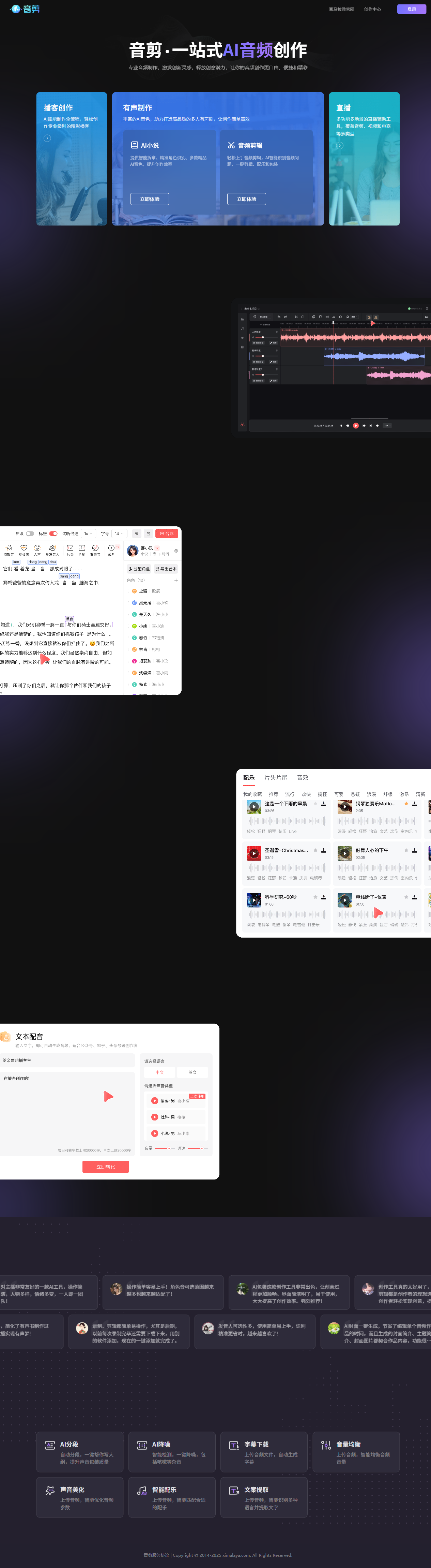 音剪(audioeditor.ximalaya.com)是喜马拉雅官方推出的云端音频创作平台,面向播客、有声书、教育讲师、自媒体及普通用户。无需安装软件,打开浏览器即可上传、剪辑、降噪、配乐、添加 AI 旁白,一键发布到喜马拉雅。平台内置版权音乐库、文字转语音、团队协作与多端同步,让创作流程从“录制”到“上架”在一个网页内完成。