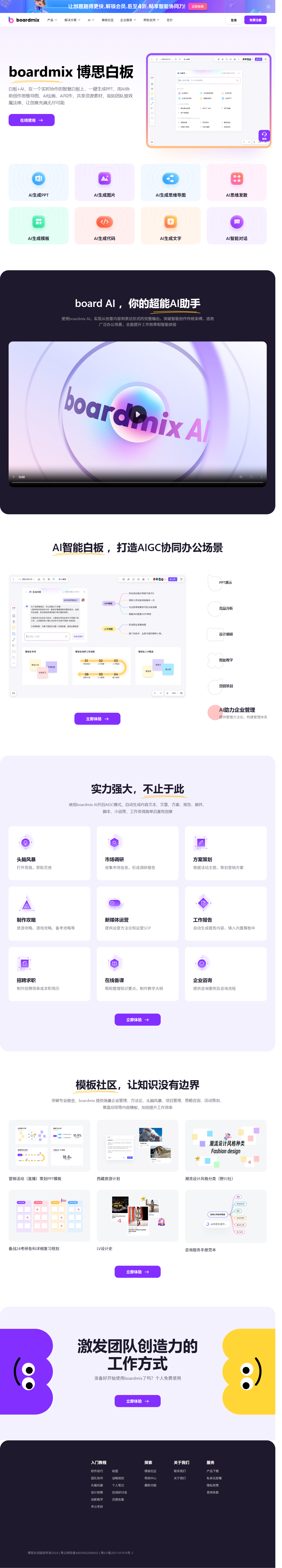 boardmix.cn/ai-whiteboard 是博思白板旗下的 AI 内容创作平台,面向团队与个人,把「无限白板」与「生成式 AI」合二为一。用户无需安装软件,浏览器即可新建画布,实时协作、绘图、贴便签;AI 助手能根据一句话指令秒出思维导图、PPT、代码、任务清单等,并支持多人同时编辑、云端自动保存、跨设备同步。