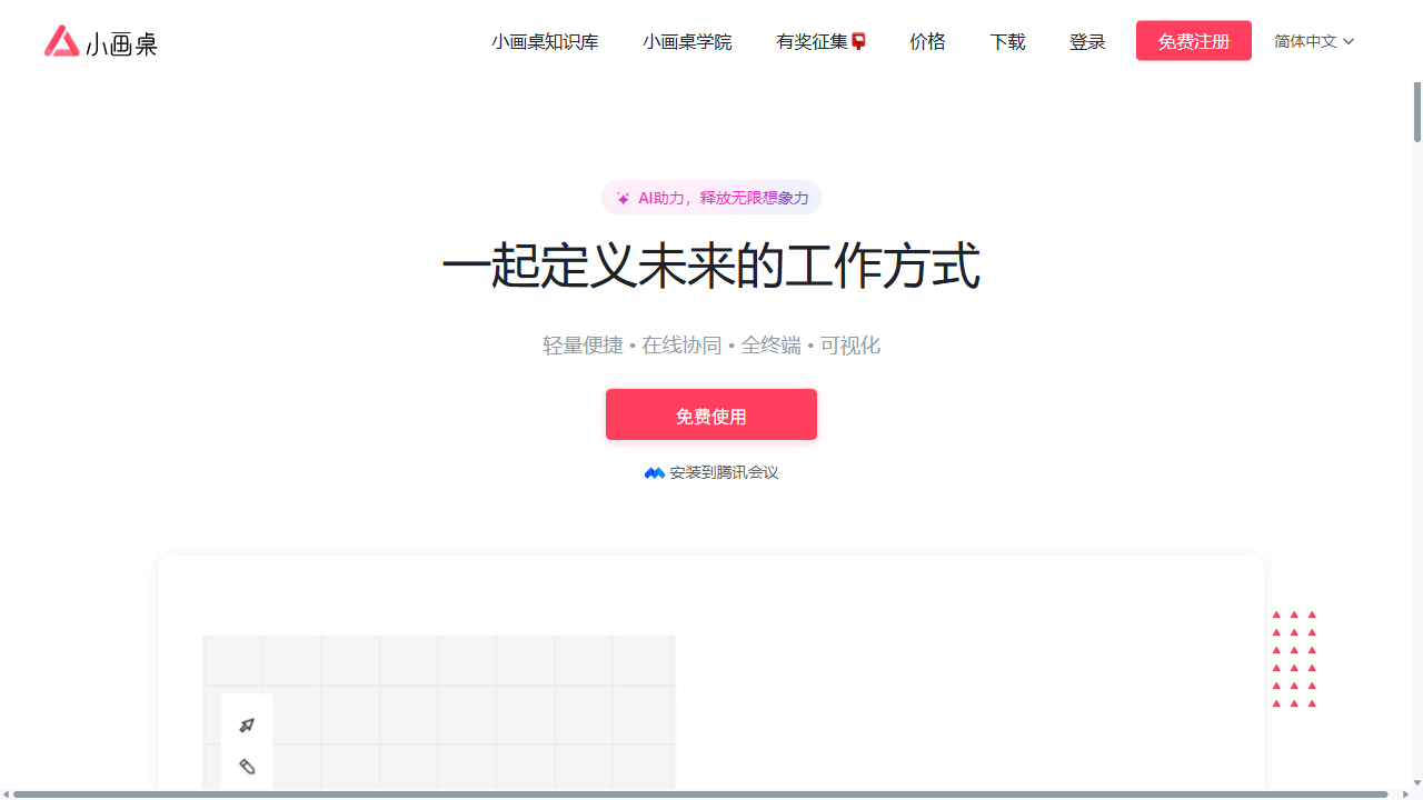 小画桌(www.xiaohuazhuo.com)是一款无需安装、打开浏览器即可使用的专业在线白板工具。它把思维导图、流程图、AIGC 智能生成、手写笔记、文档批注等多种创意表达形式整合在同一块“无限画布”上,支持多人实时协同、音视频同步、评论互动,并提供丰富的模板与素材库。无论是个人灵感捕捉还是团队远程协作,都能像面对面一样高效直观,真正做到了“一块画布,装下所有想法”。