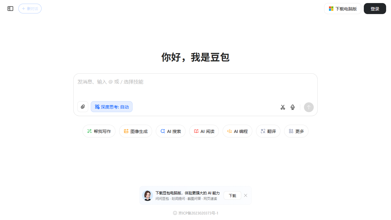 豆包(https://www.doubao.com/chat/)是字节跳动推出的中文大模型对话官网,面向个人与企业提供一站式 AI 助手服务。用户无需注册即可体验,登录后可享完整功能:智能问答、写作、翻译、代码、绘图、音乐、视频通话等。平台支持网页、桌面客户端、浏览器插件及 iOS/Android APP,账号多端同步,中文语义理解领先,响应快速,适合学习、办公、创作、生活各类场景。