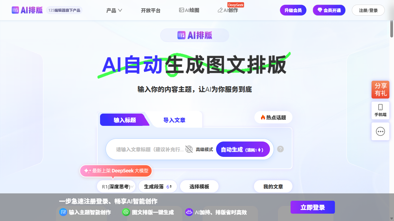 135 AI排版官网是提子科技专为新媒体人打造的在线智能排版平台。它把135编辑器多年积累的模板、素材与最新AI大模型结合,用户只需输入主题或粘贴文章,系统即可秒级生成高颜值、零版权风险的公众号图文。平台支持深色模式、多公众号协同、企业发票、永久链接等配套服务,让个人创作者到50人团队都能“写完即推送”。