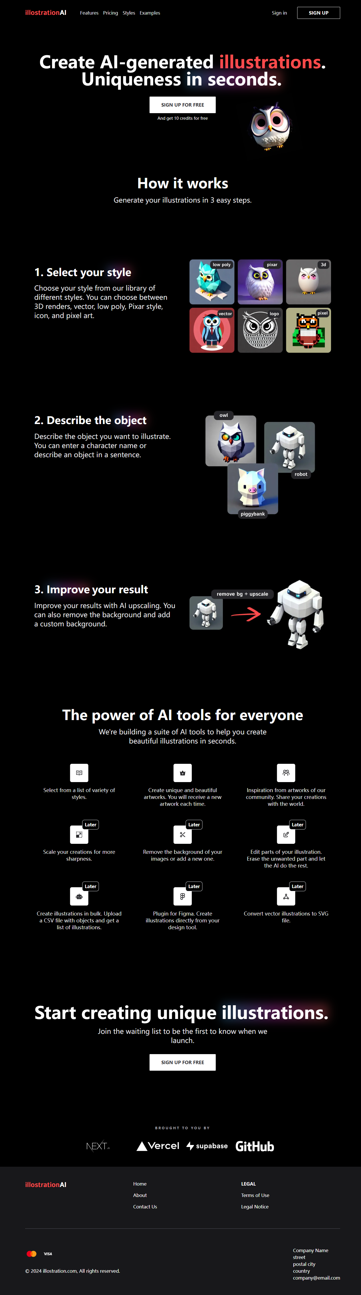 illostration 是一个面向设计师、内容创作者与营销团队的在线 AI 插画生成平台。用户只需输入一句文字描述,即可在数秒内获得高分辨率、可商用的矢量插画。平台内置数千种风格模板(扁平、手绘、3D、像素风等),支持一键换色、批量下载 SVG/PNG,并与 Figma、Canva、Notion 等主流工具无缝衔接。所有作品均通过自研模型生成,确保原创且免版权,可放心用于商业项目。无需注册即可试用,付费套餐解锁更高分辨率、团队协作及 API 调用功能。