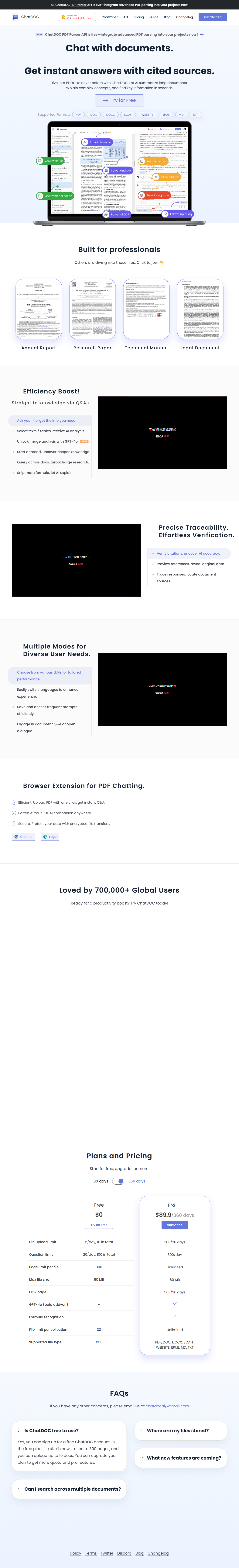 ChatDOC 是一款基于 ChatGPT 的在线文档阅读助手,支持上传 PDF、Word、PPT、EPUB 等格式,通过自然语言对话即可快速提取、定位、总结信息,并给出可溯源的原文引用。用户无需逐页翻查,直接提问即可获得精准答案,适合科研、商务、教育等场景。目前免费注册,单文件上限 150 页,可同时处理 10 个文档,未来将支持跨文档联合问答与 OCR 扫描件识别。