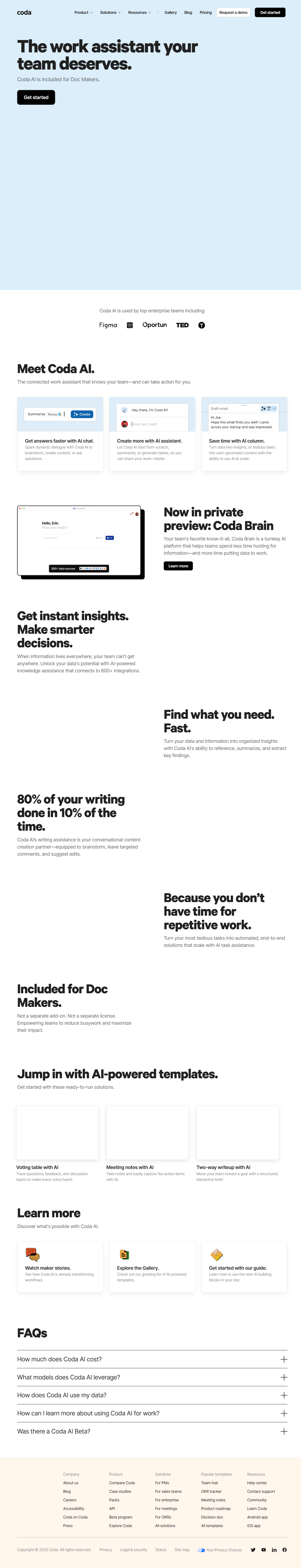 Coda AI 是 Coda.io 在 2024 年推出的 AI 原生模块,把传统文档升级为“可交互的应用”。它以“一页文档=一个应用”为核心理念,集成文字、表格、按钮、自动化与生成式 AI,团队成员无需代码即可在同一页面内完成计划、执行、分析与复盘。Coda AI 通过自然语言指令即可创建表格、生成内容、提炼洞察,并与 600+ SaaS 工具双向同步,实现从信息到行动的闭环。无论 2 人小团队还是 2 万人企业,都能用 Coda AI 把零散的笔记、数据与流程变成随需而动的“活文档”。