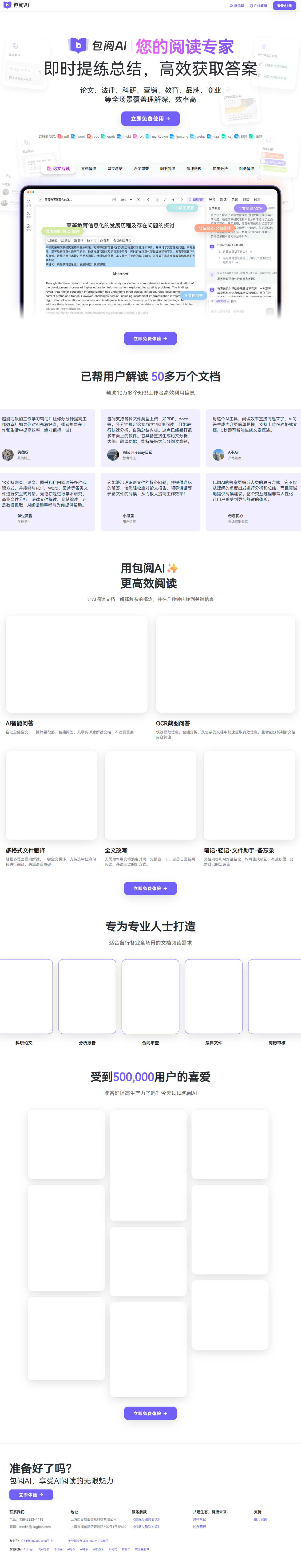 包阅AI(baoyueai.com)是一款面向学生、科研、法律、职场等人群的智能阅读平台。用户只需上传PDF、Word、图片或视频,系统即刻生成精准摘要、思维导图、章节大纲,并可进行多轮问答,深挖细节、溯源页码。平台支持中英等数十种语言互译,内置文献管理、笔记云端同步、参考文献自动生成等科研工具,也提供合同审查、案件材料速读等法律场景模板。无需安装,网页和小程序即用,免费额度+灵活订阅兼顾轻量与重度需求,让“读完一本书、吃透一篇论文”从数小时缩短到几分钟。