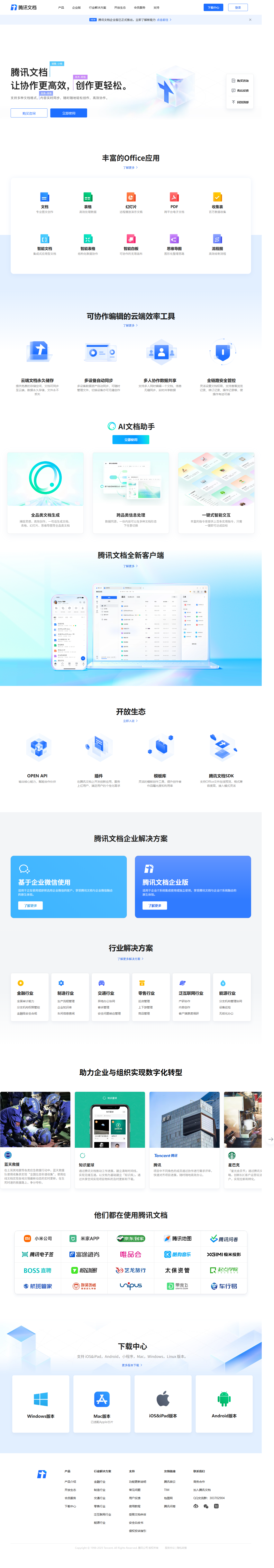 腾讯文档是腾讯推出的云端 Office 平台,用户无需安装软件,浏览器或微信/QQ 内即可创建、编辑 Word、Excel、PPT、思维导图、收集表、PDF 等多格式文档。所有文件自动保存在腾讯云,支持 Windows、macOS、iOS、Android、小程序全端同步。通过 QQ/微信帐号一键登录,即可邀请同事、同学、客户在线协作,实现真正的跨组织、跨地域实时办公。平台还提供丰富的模板市场、插件生态和企业级管理后台,适用于个人、教育、公益及大中小型企业。