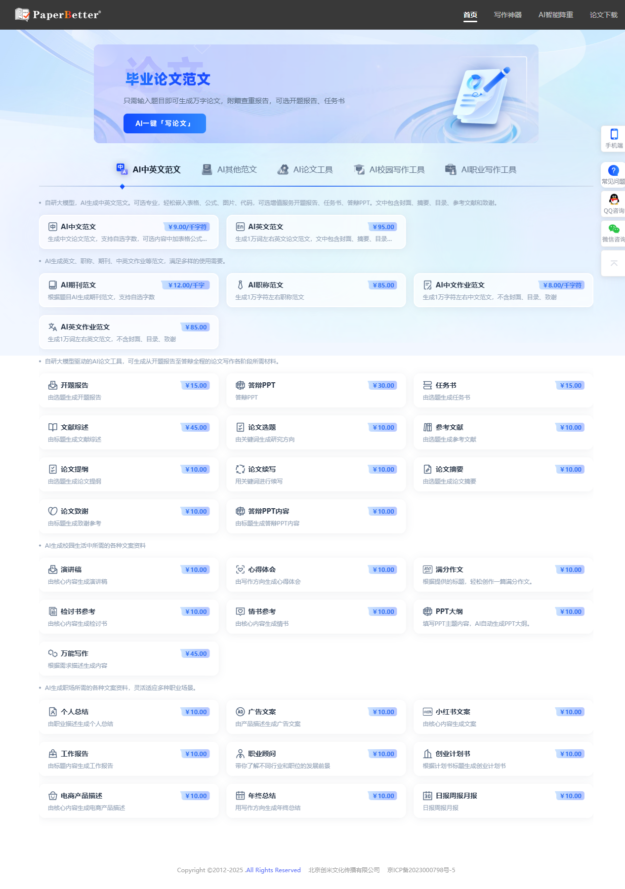 PaperBetter AI 是北京创米文化传播有限公司旗下的智能学术写作平台,2021 年上线。平台以自研大模型为核心,融合 15 亿文献与 12 大查重库,可在 10 分钟内生成中英文万字级论文初稿,并提供与高校一致的查重报告、智能降重、答辩 PPT 等配套服务,覆盖从选题到答辩的全流程,已服务全球数万学生、教师与科研人员。