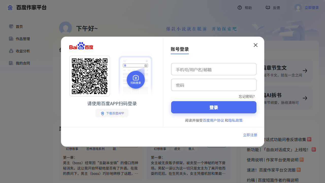 百度作家平台(zuojia.baidu.com)是百度官方推出的免费一站式网络文学写作与投稿平台,面向短篇及长篇小说作者,提供在线创作、云端存储、作品管理、收益统计、社区互动等服务,并依托百度AI技术,为创作者提供续写、润色、起名、细纲生成等智能辅助,帮助作者突破灵感瓶颈、提升写作效率与作品质量。