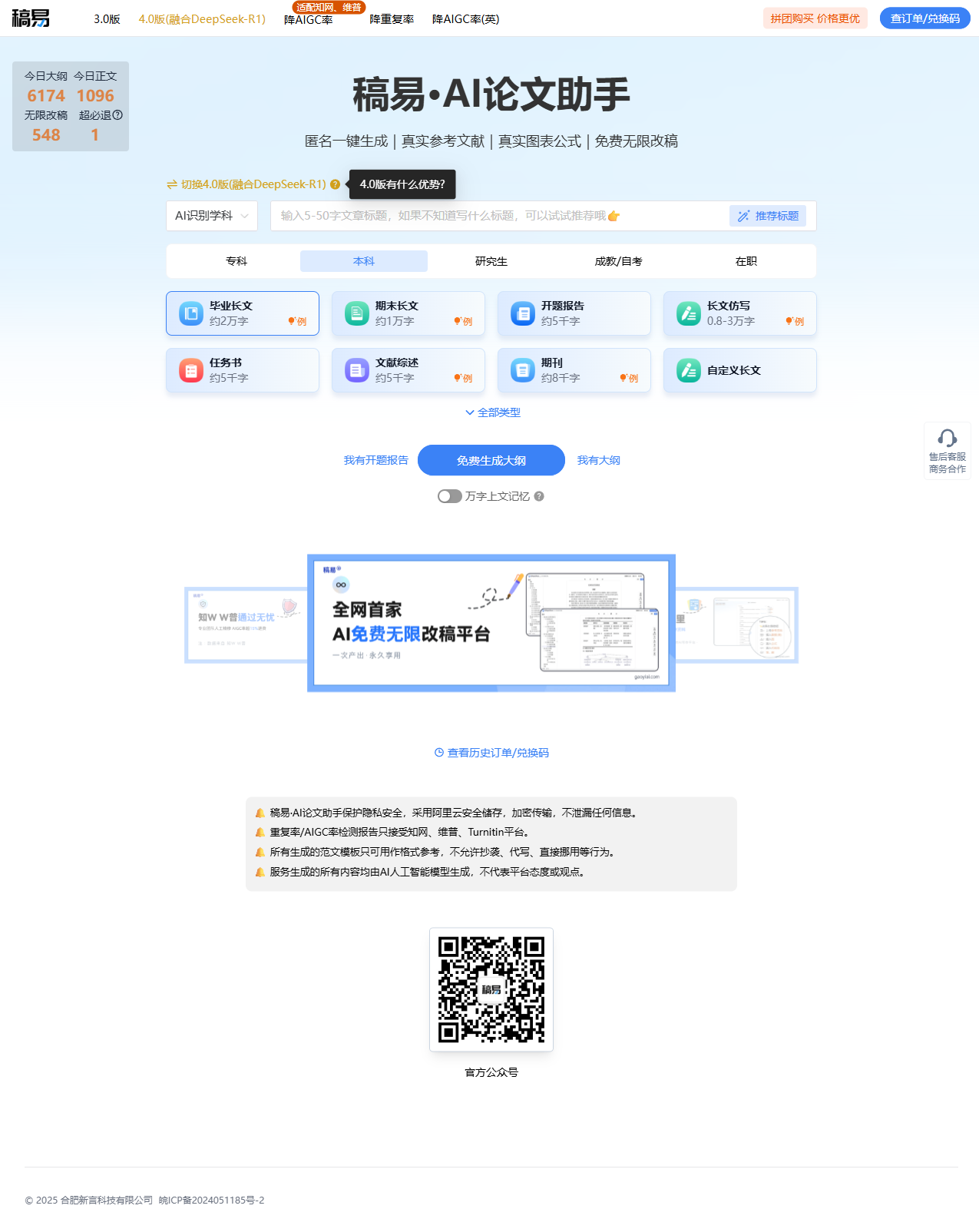 稿易AI(gaoyiai.com)是面向学生、科研人员的AI论文写作平台。输入题目即可免费获得2000字大纲,3-5分钟一键生成含图表、公式、代码、40篇参考文献的完整论文,并支持无限次改稿。平台无需注册,数据30天自动删除,承诺查重率低于15%,不达标全额退款。